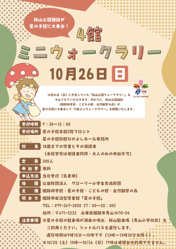 桜山ミニウォークラリー 2025年10月7日 最終更新日時 : 2025年10月10日 subsite 10月26日(日)星の子館で桜山ミニウォークラリー開催。 こどもの館はなかよしホールでふわふわボールをします。参加してみませんか?