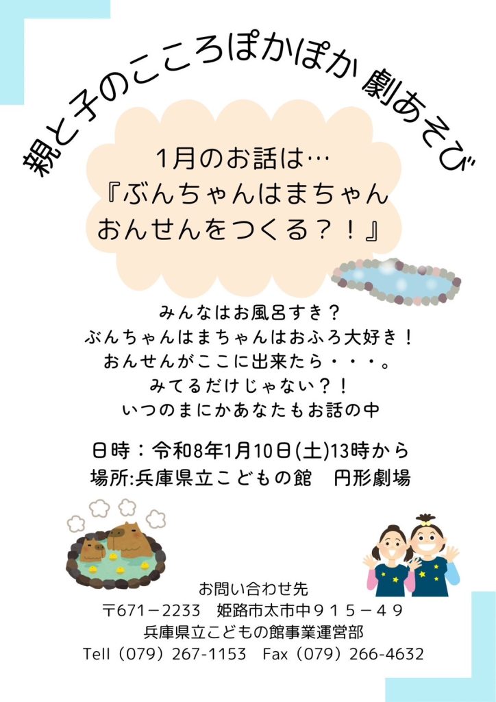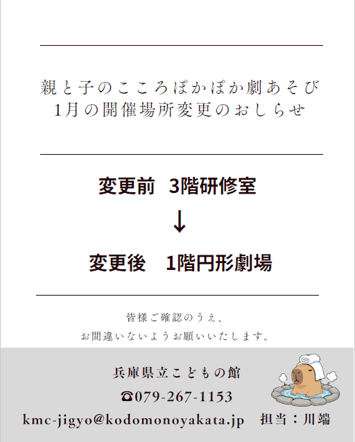 1月の劇あそび 開催場所変更のお知らせ 2025年12月18日 最終更新日時 : 2025年12月18日 subsite 都合により、1月の「親と子のこころぽかぽか劇あそび」の開催場所を下記のとおり変更いたします。 皆様ご確認のうえ、お間違いないようお願いいたします。 ・変更前:3階 研修室 ・変更後:1階 円形劇場