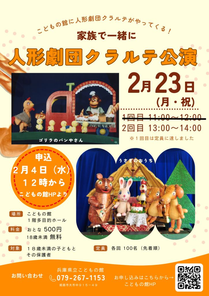 2月23日(月・祝)11時から、13時から人形劇団クラルテ 公演を開催します。