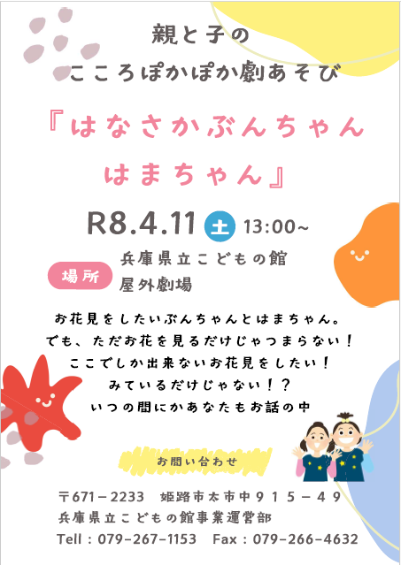 4月親と子のこころぽかぽか劇あそび 2026年3月14日 最終更新日時 : 2026年3月14日 subsite 4月11日(土)13時から 3階屋外劇場にて 劇あそびを行います! 事前申し込みはありませんので、当日のご参加、お待ちしております!