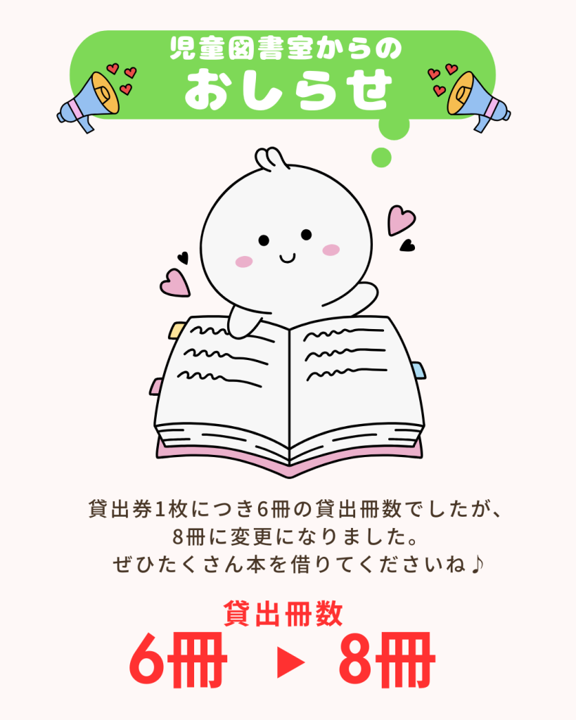 児童図書室からのお知らせ 2026年4月3日 最終更新日時 : 2026年4月3日 subsite 貸出券1枚につき6冊の貸出冊数でしたが、令和8年4月2日より8冊に変更になりました。 ぜひ、たくさん本を借りてくださいね