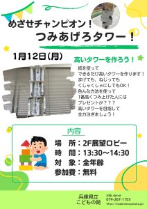 毎月1回 展望ロビーにて 13:30から受付開始! 11月の、めざせチャンピオンは、ねらってわなげです。 日にち:1月12日(月) 場所:2F展望ロビー 時間:13:30~14:30 対象:全年齢 参加費:無料 参加おま […]