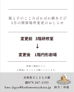 都合により、1月の「親と子のこころぽかぽか劇あそび」の開催場所を下記のとおり変更いたします。 皆様ご確認のうえ、お間違いないようお願いいたします。 ・変更前:3階 研修室 ・変更後:1階 円形劇場