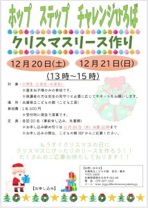 子ども達が自分で考え行動することを大切に、社会で必要な「生きる力」を育む 様々な体験活動を行います。 12月は「クリスマスリース作り」です! 参加費は1名500円で、小学生が対象です。みなさまのご参加お待ちしております! […]