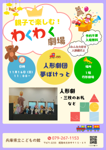 11月16日(日)11時~人形劇団「夢ぽけっと」がやってくる! 申込不要入場無料場所:こどもの館1F円形劇場開場:10時45分 楽しい人形劇で少しのんびり過ごしてみませんか? み […]