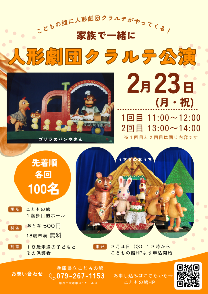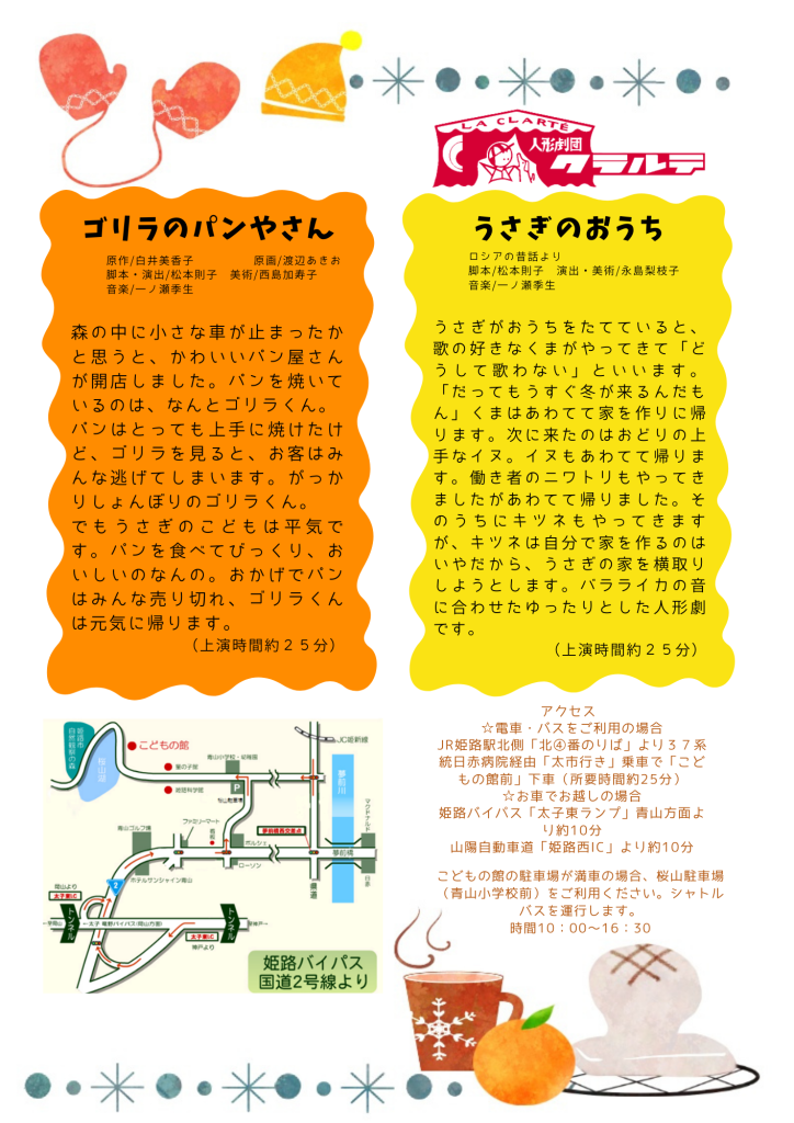 2月23日(月・祝)11時からと13時から、クラルテ公演を開催します。