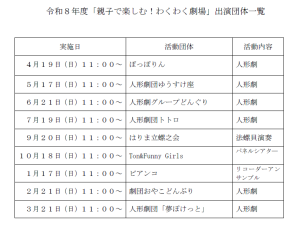 親子で楽しむ!わくわく劇場 イベント詳細 このイベントは 2026年 6月 21日 から 2027年 3月 21日 まで開催しています。 次回の開催は 2026年6月21日 11:00 AM です。 カテゴリ: イベント 開催日: 2026年6月21日 11:00 AM – 11:40 AM2026年7月19日 11:00 AM – 11:40 AM2026年9月20日 11:00 AM – 11:40 AM2026年10月18日 11:00 AM – 11:40 AM2027年1月17日 11:00 AM – 11:40 AM2027年2月21日 11:00 AM – 11:40 AM2027年3月21日 11:00 AM – 11:40 AM 2025年5月9日 最終更新日時 : 2026年4月25日 subsite 申込不要入場無料場所:こどもの館1F円形劇場開場:10時45分 楽しいパフォーマンスを見てのんびり過ごしてみませんか? みなさまのお越しをお待ちしております。