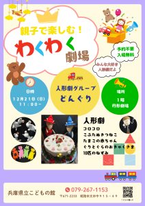 親子で楽しむ!わくわく劇場 イベント詳細 このイベントは 2025年 12月 21日 から 2025年 12月 21日 まで開催しています。 次回の開催は 2025年12月21日 11:00 AM です。 カテゴリ: イベント, 劇・公演 開催日: 2025年12月21日 11:00 AM – 12:00 PM 2024年11月11日 最終更新日時 : 2025年11月21日 subsite 12月21日(日)11時~人形劇グループ どんぐり がやってくる! 申込不要 入場無料 場所:こどもの館1F円形劇場 開場:10時45分 楽しい人形劇で少しのんびり過ごしてみませんか? みなさまのお越しをお待ちしております。